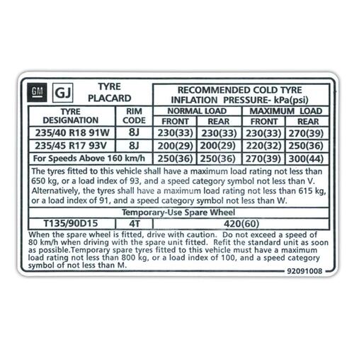 NLA RSP Tyre Placard Decal V2 Monaro Suit 17&18 Inch Wheel genuine gm 92091008